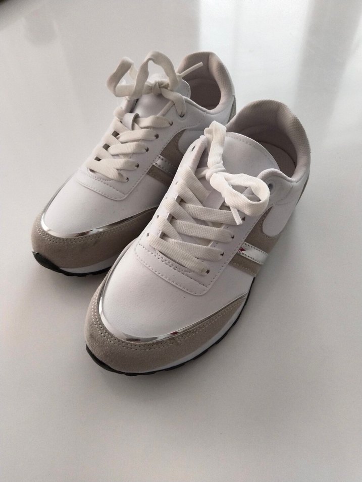 Gri detaylı beyaz kadın spor ayakkabısı, rahat tabanlı, sokak stiline uygun şık tasarım. Sıfır üründür Hiç Kullanılmamıştır