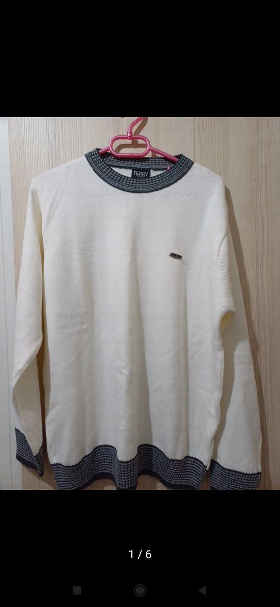 Uzun kollu, yuvarlak yaka beyaz pamuklu triko kazak. Gri ribanalı yaka, manşet ve etek ucu detaylarıyla rahat kesim ve normal boyda.