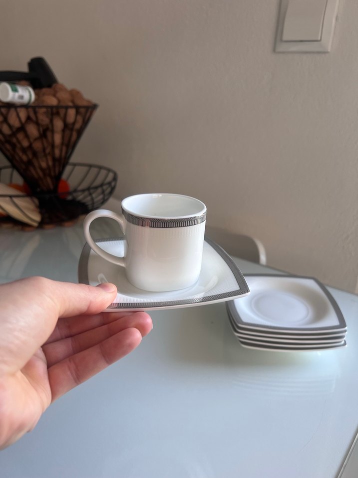 Gri desenli kenarları ve kare tabaklarıyla beyaz kahve fincanı takımı, espresso veya küçük kahve porsiyonları için uygundur. ☕