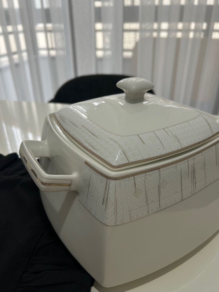 Gri detaylı, kapaklı beyaz porselen güveç, düz ve desen içermeyen yüzeyi ile kullanışlı kulplara sahiptir.Hiç kullanılmadı