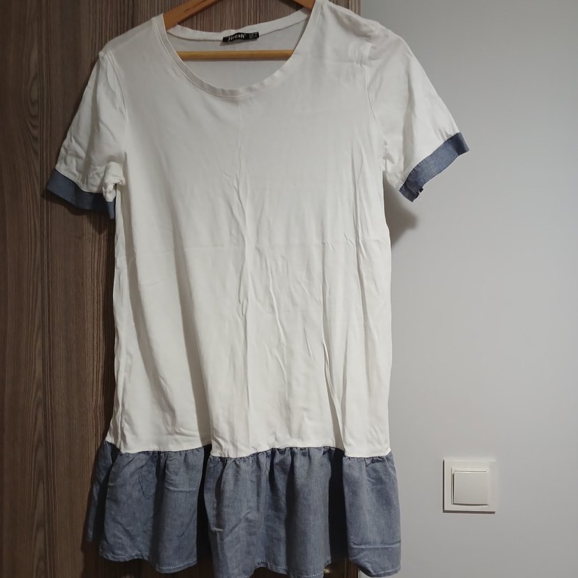 Beyaz keten midi elbise, kısa kollu ve gri manşet detaylıdır. Salaş kesimiyle rahat ve şık bir görünüm sunar.