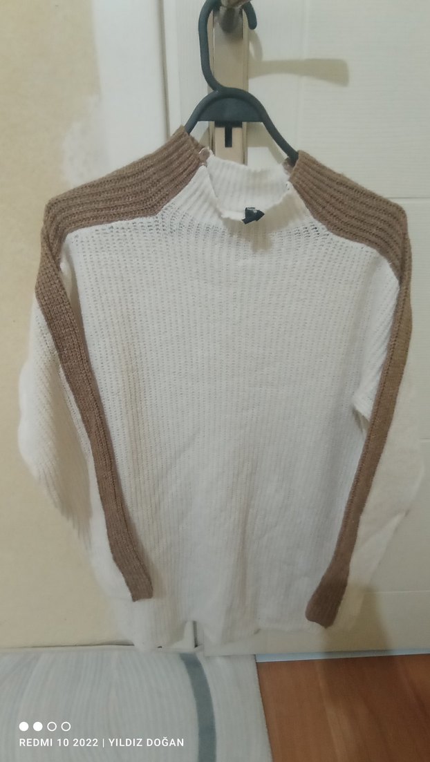 Bu beyaz örgü kadın kazak, gri omuz ve kol detaylarına sahip uzun kolludur. Yuvarlak yakalı, bol kesim ve rahat bir sokak stili sunar.