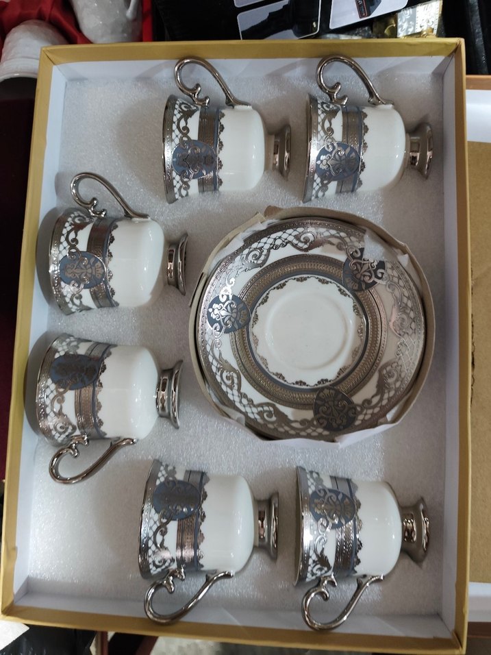 Gri desenli beyaz porselen 6 adet fincan ve uyumlu tabaklardan oluşan set. Her fincan zarif kulplu ve detaylı desenlidir. ☕