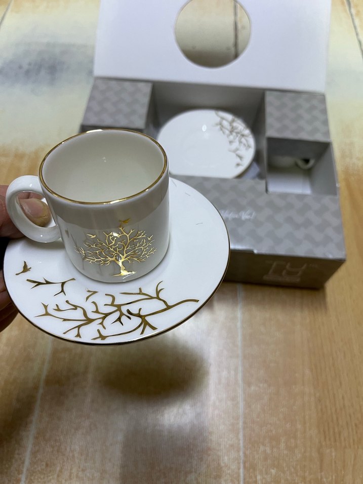 Beyaz porselen fincan takımı, fincan ve tabağında gri ve altın renkli ağaç dalı desenleriyle şık bir görünüm sunar. 12 parça