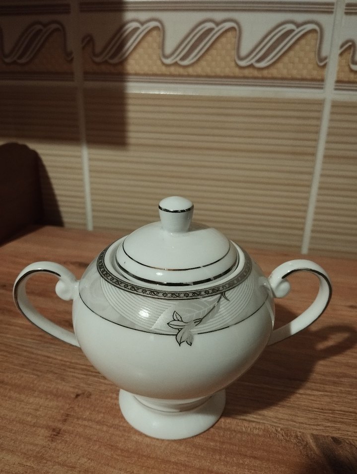 İki kulplu beyaz porselen şekerlik, gri dekoratif detaylarla süslenmiştir. Üstünde küçük kulplu kapak bulunmaktadır.