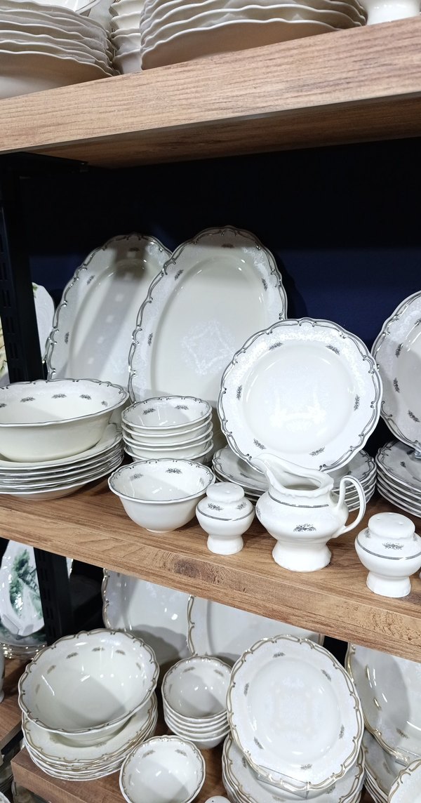 Gri detaylı beyaz yemek takımı, tabaklar, kaseler ve servis parçalarından oluşur. Zarif dalgalı kenar tasarımı. ️