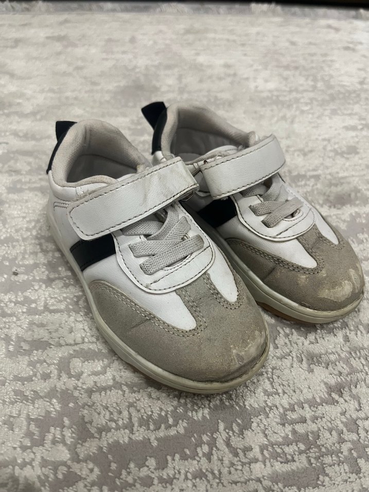 Erkek çocuklar için beyaz ve gri renklerde, kolay giyilen cırt cırtlı spor ayakkabılar. Kauçuk tabanlı, sokak tarzına uygun rahat model.