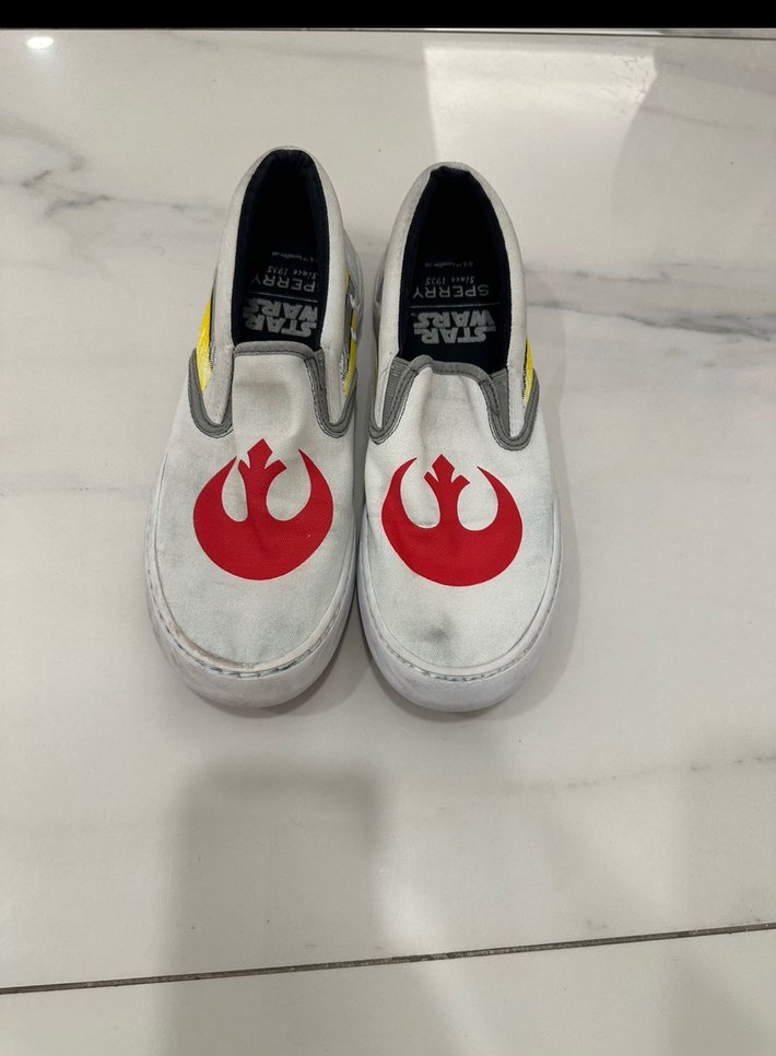 Gri detaylı beyaz erkek çocuk spor ayakkabısı, Star Wars baskılı. Nadir bulunan bir modeldir. Amerika’dan alındı. Orjinaldir. Rahattır