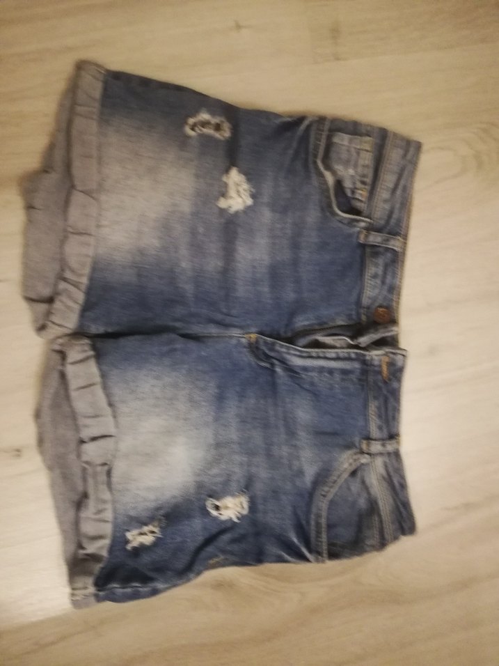 Kadınlar için düğmeli, bol kesim mavi denim mini şort. Gri tonlarında soluk ve yırtık detaylara sahip, günlük sokak stili için uygundur.