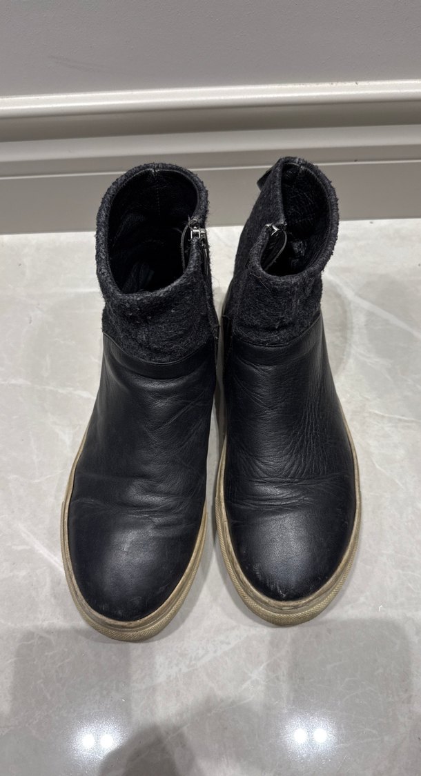 Siyah deri kadın botlar, dolgu topuklu ve bilekte gri kumaş detaylıdır. Tokalı olup günlük rahat kullanıma uygundur.
