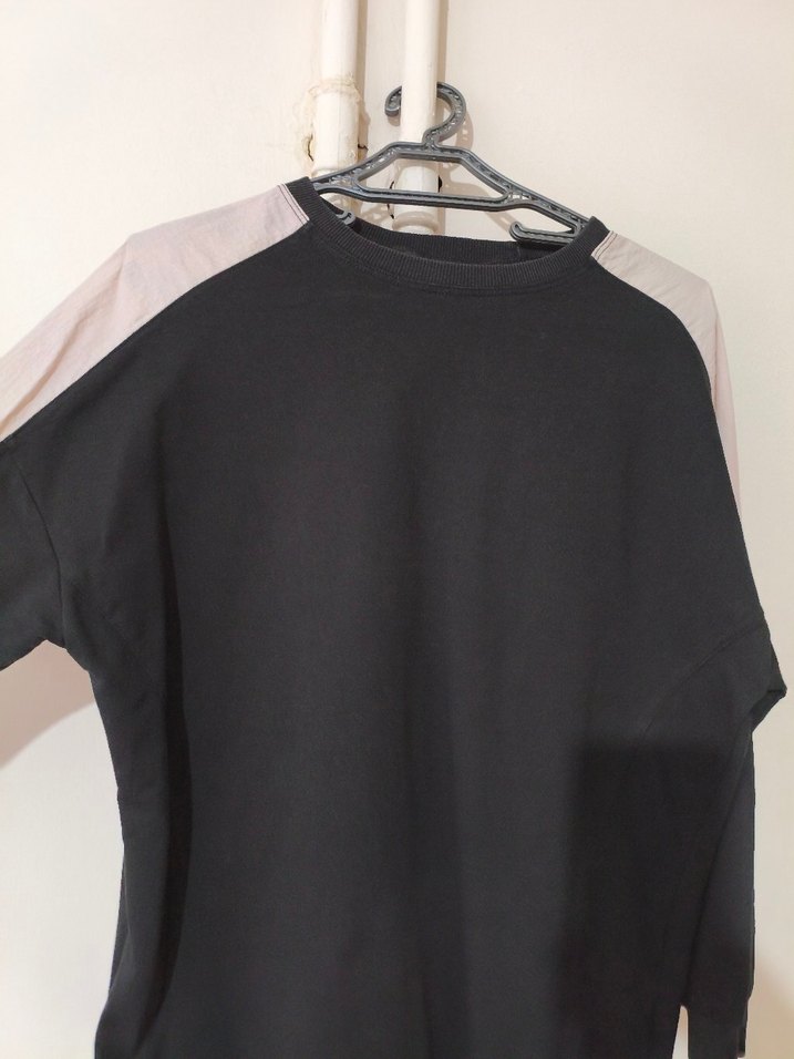 Kadın sweatshirt, yuvarlak yaka ve kısa kollu, bol kesimdir. Siyah rengi ve gri omuz detaylarıyla rahat bir kullanım sunar. Düz desensiz, gündelik sokak stili için uygundur.