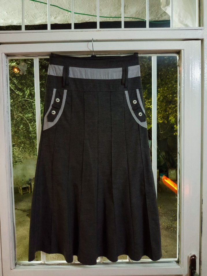Siyah uzun etek, piliseli tasarımı ve düğmeli gri cep detaylarıyla sentetik kumaştan yapılmıştır. Rahat kesimiyle günlük kullanıma uygundur. Sadece 1 kez kullanıldı❤️