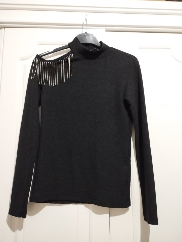 Yüksek yakalı ve uzun kollu, ince yapılı siyah kazak. Yumuşak dokulu sentetik örgü kumaştan üretilmiş, tek omuzda gri zincir detayı bulunur. Günlük kullanıma uygundur.