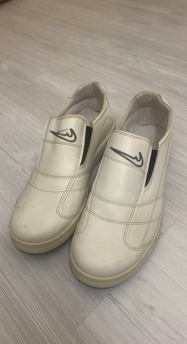 Bu beyaz spor ayakkabıları, gri detaylı dolgu topuklu ve minimalist tasarıma sahiptir. Kauçuk malzemeden üretilmiş, rahat ve şık bir sokak stili sunar.