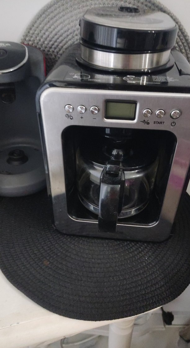 Gri renkli kahve makinesi, dijital ekran ve kolay kullanımlı tuşlara sahiptir. Başlatma düğmesi ile pratik kullanım sunar. ☕
