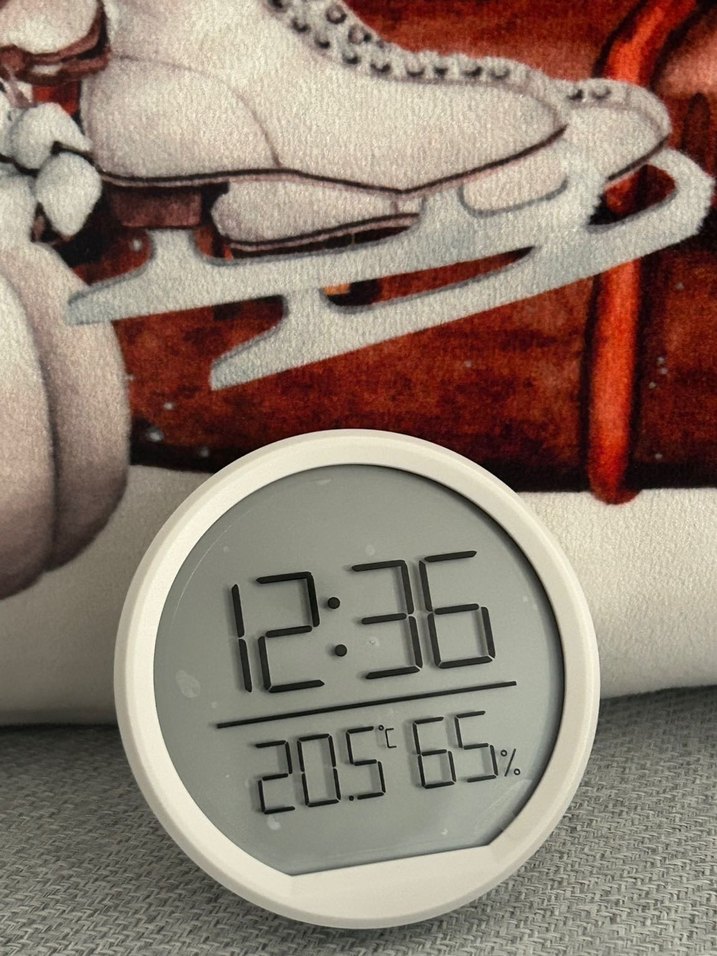 Gri dijital cihaz, ekranda zamanı, sıcaklığı ve nem oranını net şekilde gösterir. 12:36 zamanı, 20.5°C sıcaklık ve %66 nem oranı görünür.