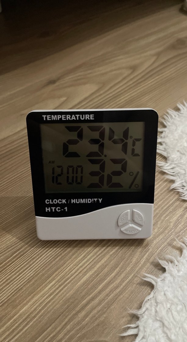 Gri dijital cihaz, sıcaklık, nem ve saati gösterir. 23,4°C sıcaklık ve %32 nem değerlerini net LCD ekranda sunar. Model HTC-1. ️
