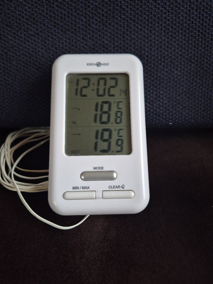 Gri dijital termometre, sıcaklık, zaman ve mod ayarlarını gösteren net ekrana sahiptir. Mod, min/max ve temizleme düğmeleri bulunur. temiz kullanıldı ihtiyac fazlasi