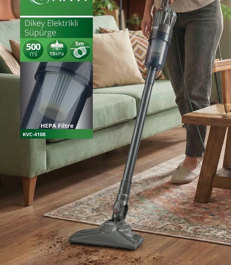 Gri renkli KVC-4108 dikey elektrikli süpürge, 500 ml toz haznesi, 15kPa emiş gücü ve HEPA filtreye sahiptir. 5 metrelik kablo uzunluğu bulunur.aşırı iyi çekiyor .