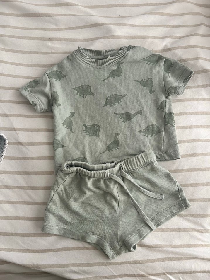 Kısa kollu, yuvarlak yaka üst ve elastik bel şorttan oluşan, pamuklu gri dinozor baskılı bebek takımı.