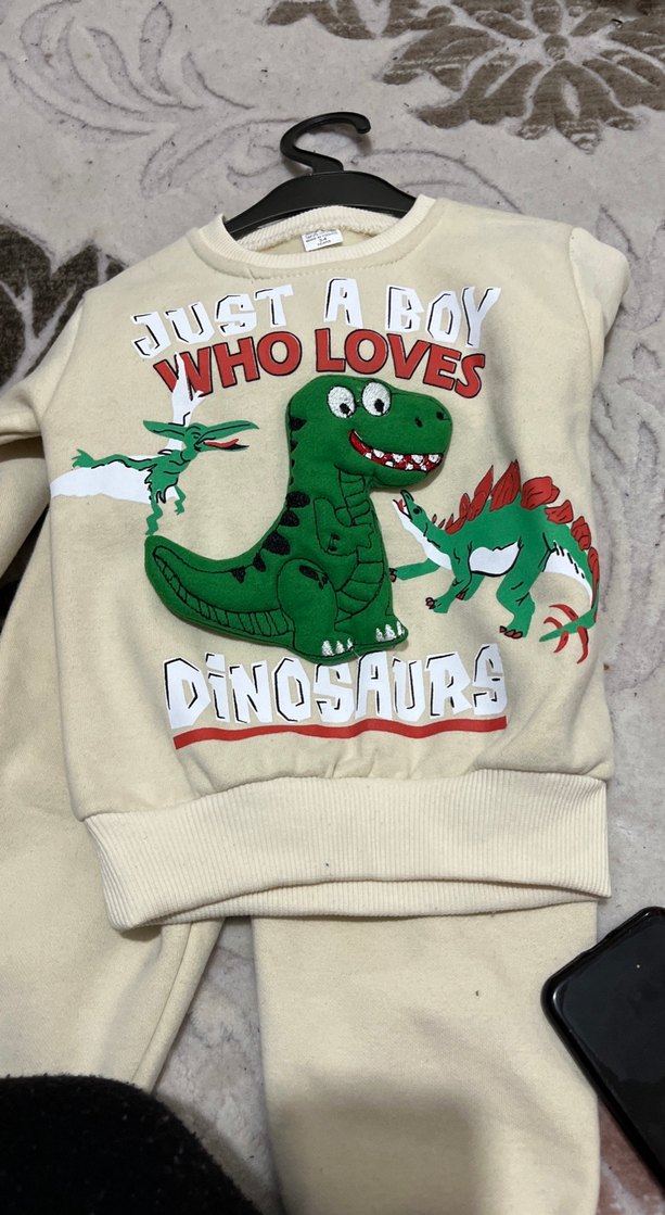 Açık gri, uzun kollu, yuvarlak yakalı, bol kesim erkek sweatshirtü. Yumuşak kumaş, dinozor baskılı ve cırt cırtlı detaylı.
