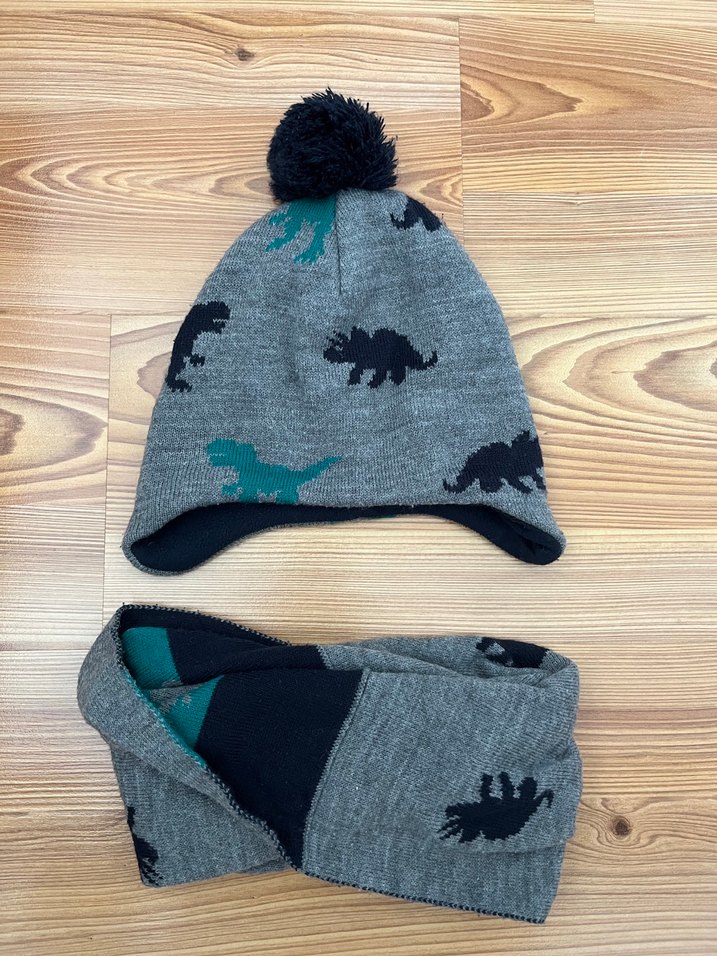 Gri renkli, ponponlu örgü bere ve dinozor nakışlı uyumlu atkıdan oluşan şık sokak stili seti.