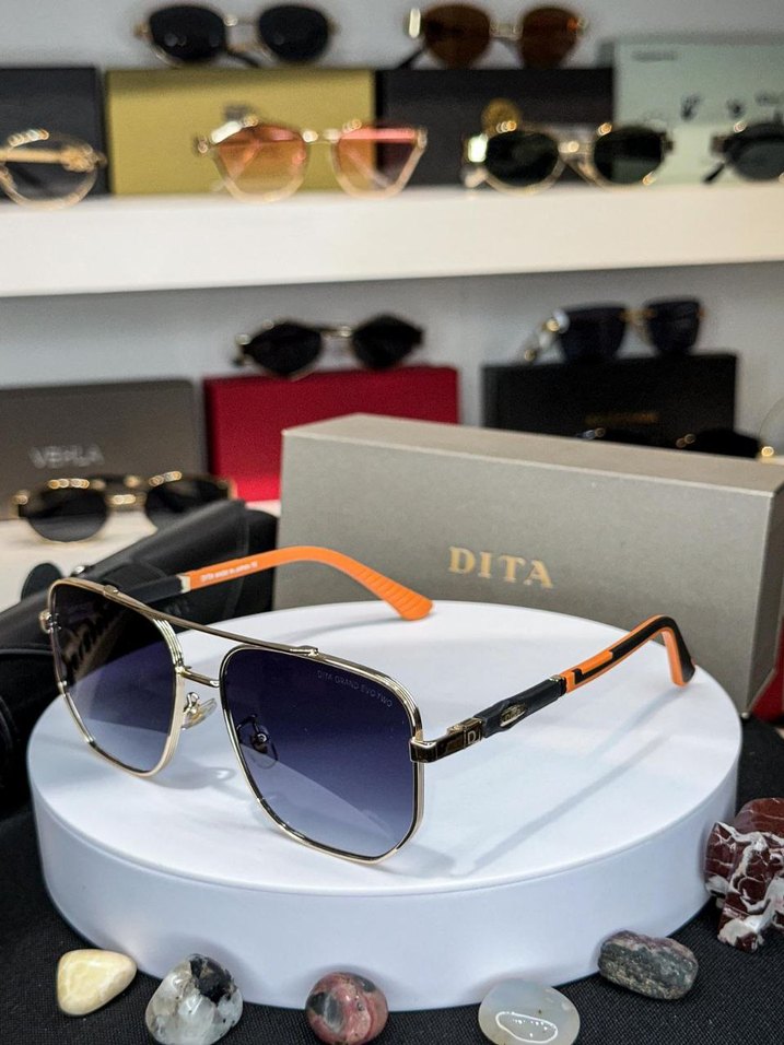DITA markalı erkek güneş gözlüğü, gri camlar ve turuncu detaylı şık çerçevesiyle klasik sokak tarzını tamamlar.