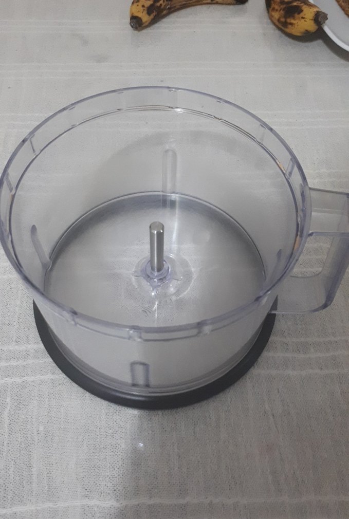 Gri plastik malzemeden yapılmış blender veya doğrayıcı haznesi. Malzemeleri işlemek için kulplu ve ortasında bıçak takmak için mil bulunur.