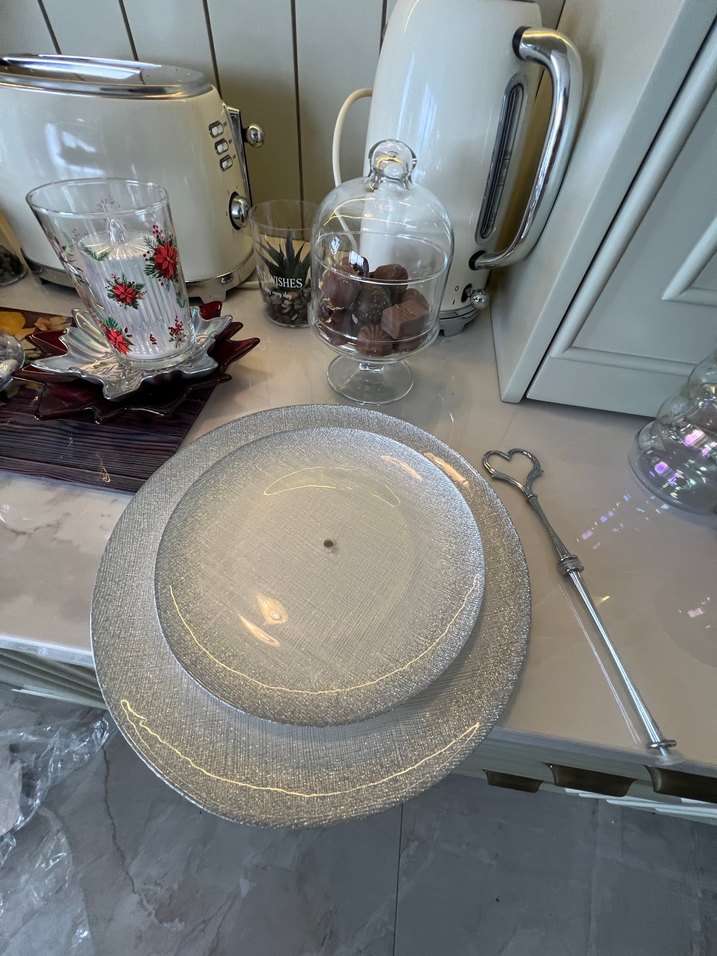 Kutabiyelik, griyi ve beyaz simli cam, gri dokulu. Beyaz ve gri tonlarda, çağdaş tasarıma sahip, yemek servisinde kullanılabilir. SATIN ALMADAN İLETİŞİME GEÇİNİZ LÜTFEN