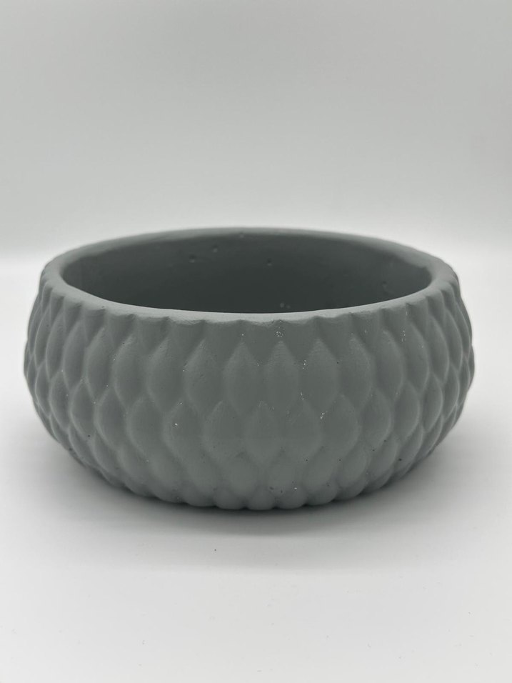 Yuvarlak şekilli ve dokulu yüzeye sahip gri vazo, dekoratif kullanım için uygundur.