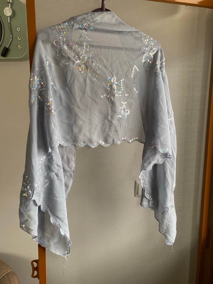 Kullanilmadi öylece duruyordu..ipleri makasla temizlernmeli …sifon gibi kumas Gri renkte, yumuşak sentetik kumaştan yapılmış, boncuk ve payet işlemeli drapeli bohem kadın şalı.