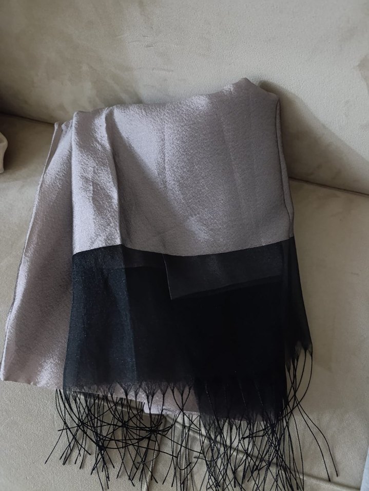 Kadınlar için gri renkte, drapeli tasarıma sahip, yumuşak sentetik kumaştan yapılmış bohem tarzda şal. Siyah püskül detaylarıyla şık ve rahat.son görselde kusur belirtildi
