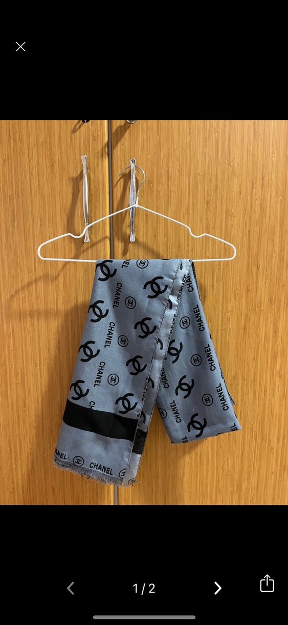 Gri, ipek gibi yumuşak dokulu drapeli şal, Chanel logosu baskılı, Paris sokak modası tarzında şık ve rahat.
