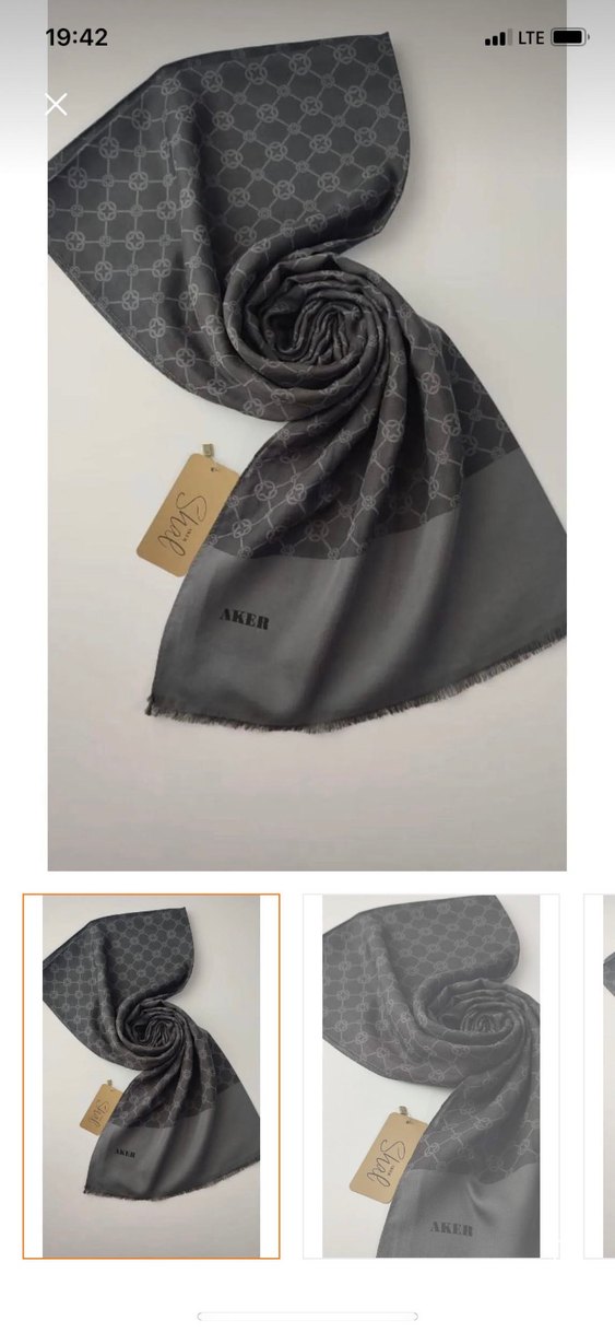 Yumuşak sentetik kumaştan, drapeli tasarıma sahip gri kadın şalı. AKER logosu ve ince desenlerle sade ve rahat bir tarz sunar.