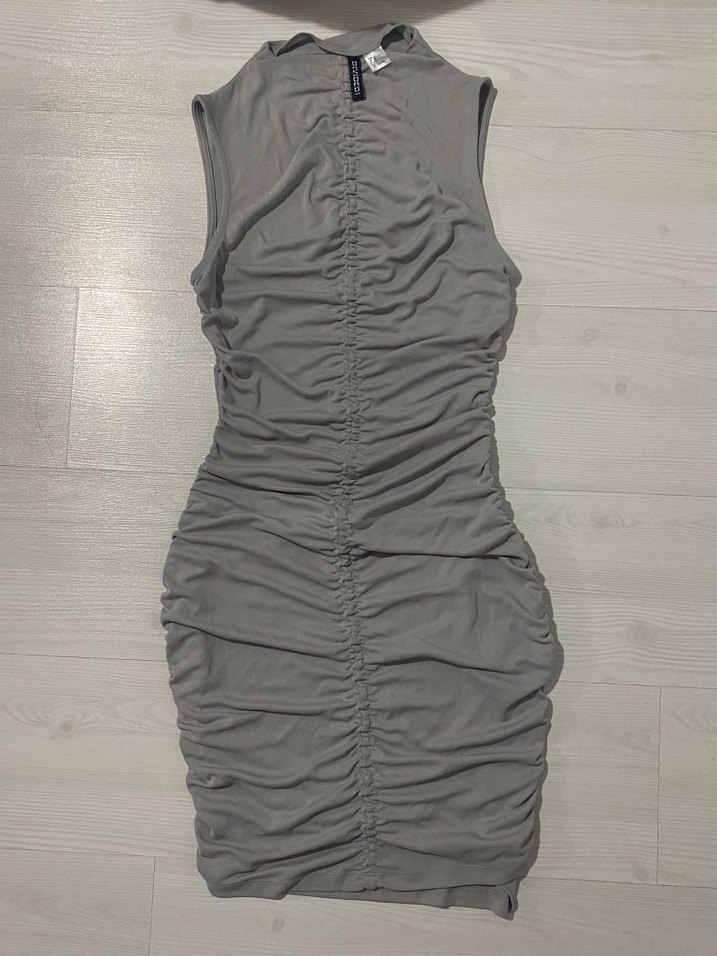 Gri renkli, kolsuz ve yüksek yakalı bu drapeli mini elbise, keten dokusuyla minimalist ve şık bir görünüm sunar. Romantik akşamlar için ideal.
