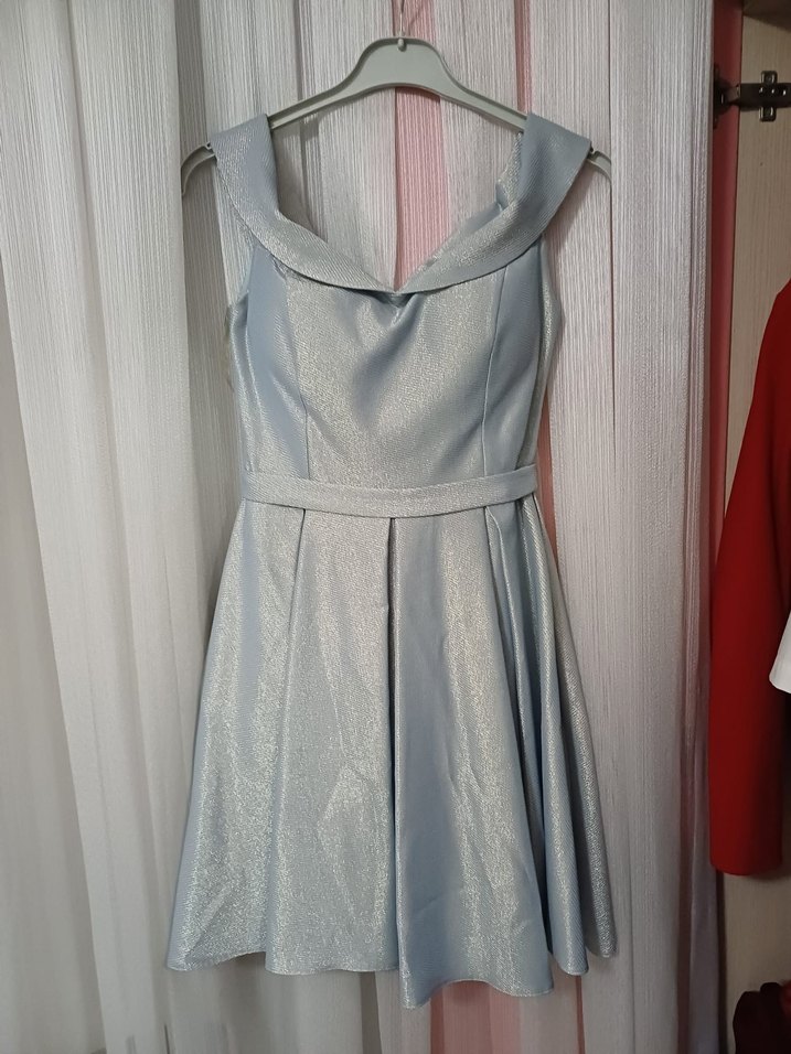 Bu gri abiye elbise, drapeli yakası ve kolsuz tasarımıyla klasik ve modern bir görünüm sunar. Midi boyu ve hafif ışıltısı, vintage esintili şıklık katar.