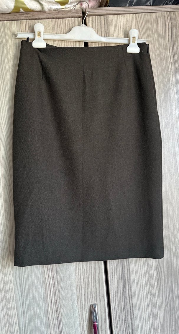 Gri renkte, drapeli midi kalem etek. Sentetik kumaştan, normal kesim ve iş ortamına uygun sade bir tasarıma sahip.