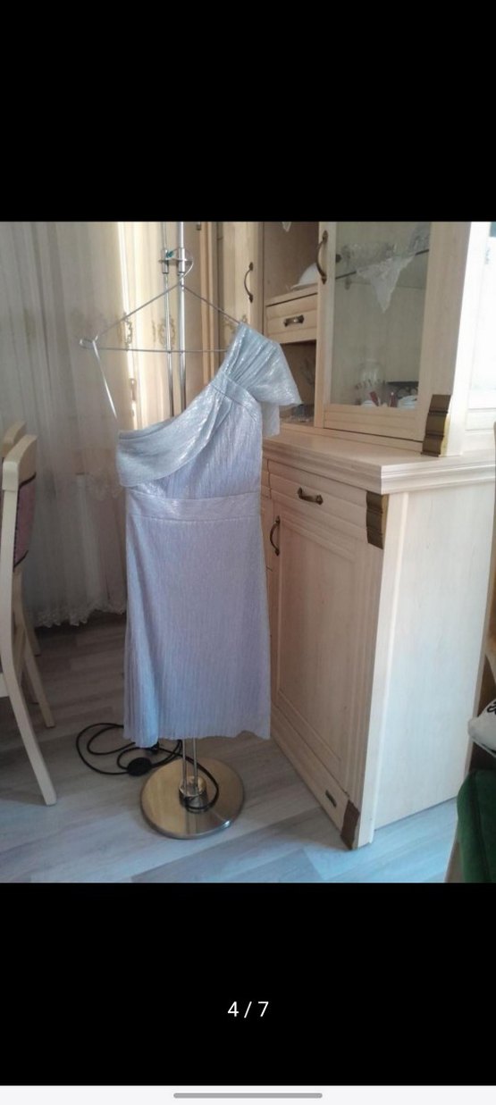 Gri renkte, drapeli ve straplez kesime sahip, midi boy ve vücuda oturan abiye elbise. Kolsuz ve desensiz, modern davetler için uygundur. ✨Simli yepyeni küçük geldiği için satilik