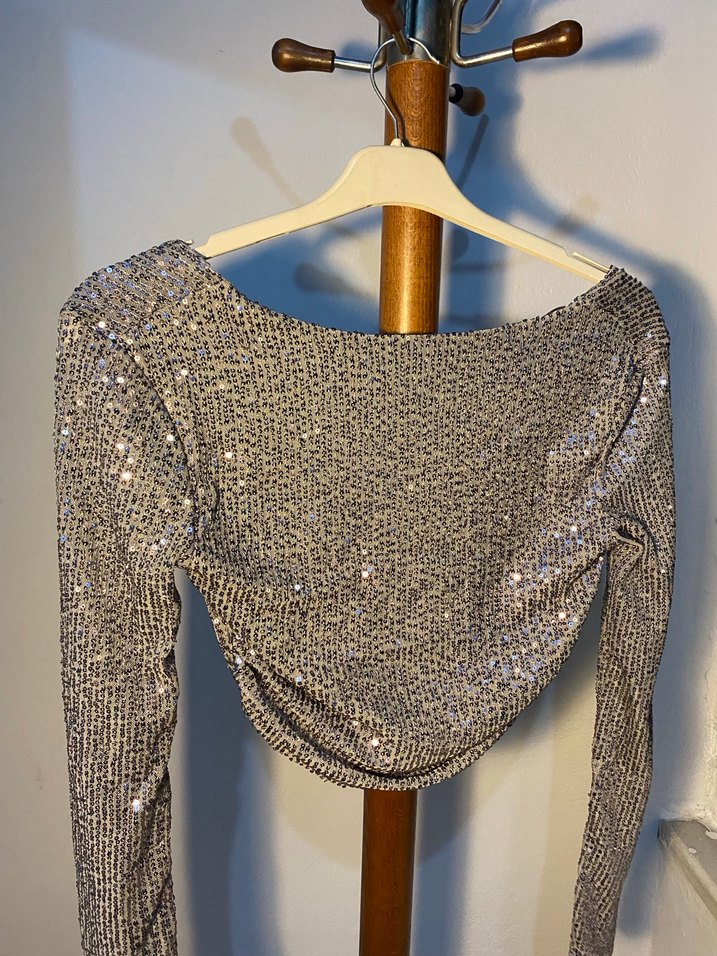 Teknolojik kumaştan yapılmış, drapeli ve dar kesim gri bluz, uzun kollu ve kayık yaka. Kısa boyu ile parti ve sokak stiline uygun. ✨