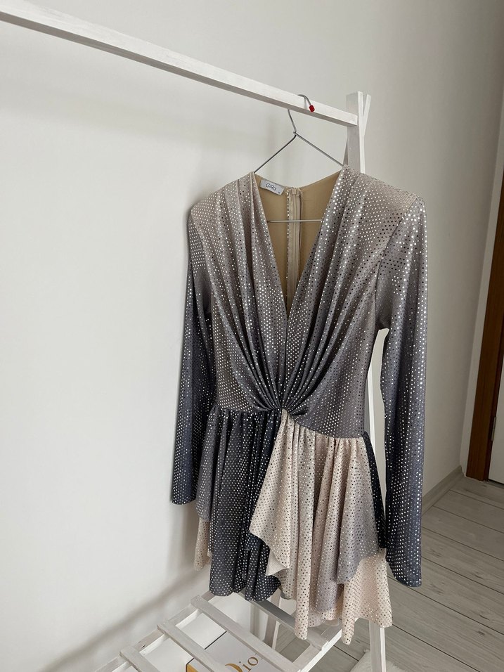Gri renkli, V yaka ve uzun kollu, drapeli mini abiye elbise. Salaş kesim ve batik desenlidir, parti için uygundur.
