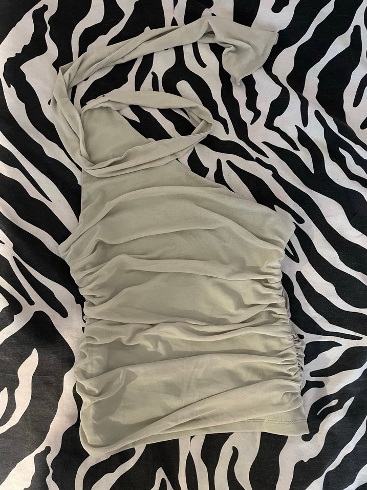 Tül ve parlak kumaştan yapılmış, straplez yaka ve askılı kısa kesim, drapeli, vücuda oturan bluz. 1 kere giyildi
