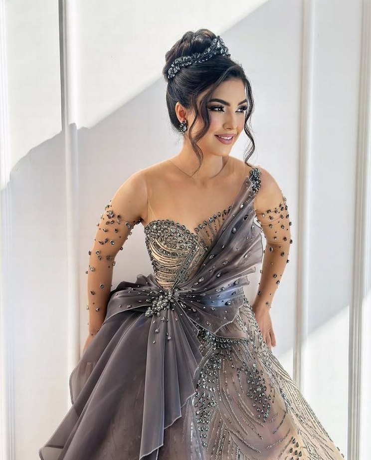 Gri renkte, straplez yaka ve drapeli detaylara sahip, uzun ve vücuda oturan nişan elbisesi. Desenli ve taş işlemeli, modern ve gösterişli tarzda tasarlanmıştır.