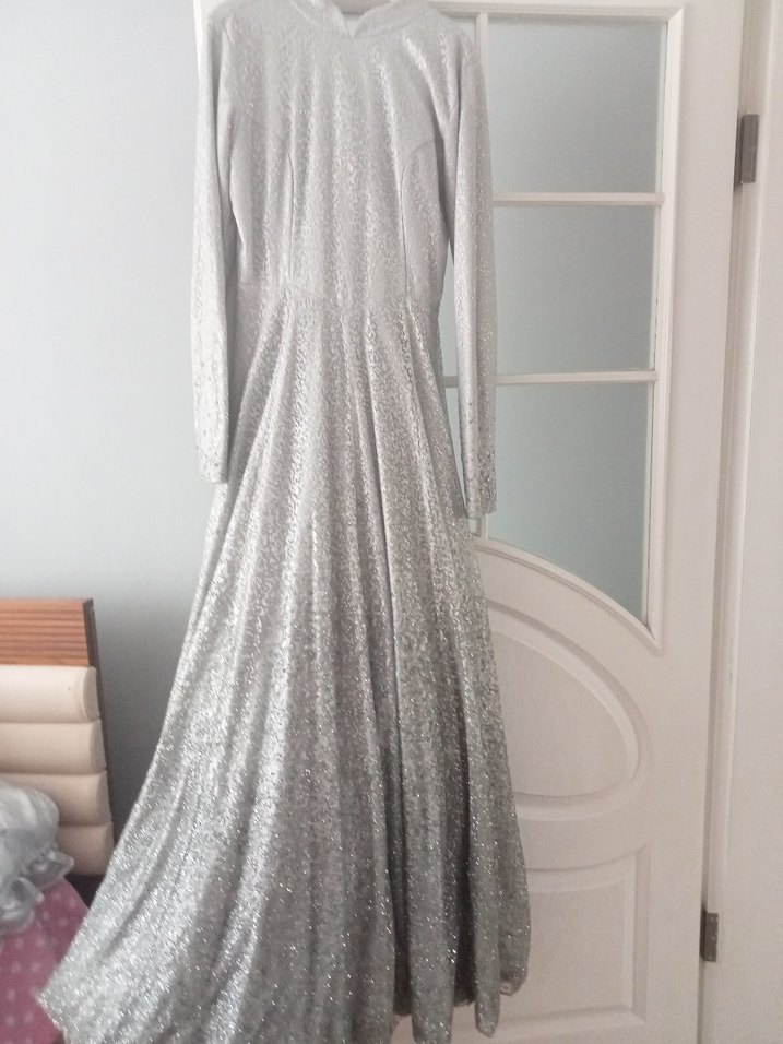 Gri renk, drapeli uzun abiye elbise. V yaka ve uzun kollu, bol kesim, parlak kumaşla düğünler için uygun. ✨