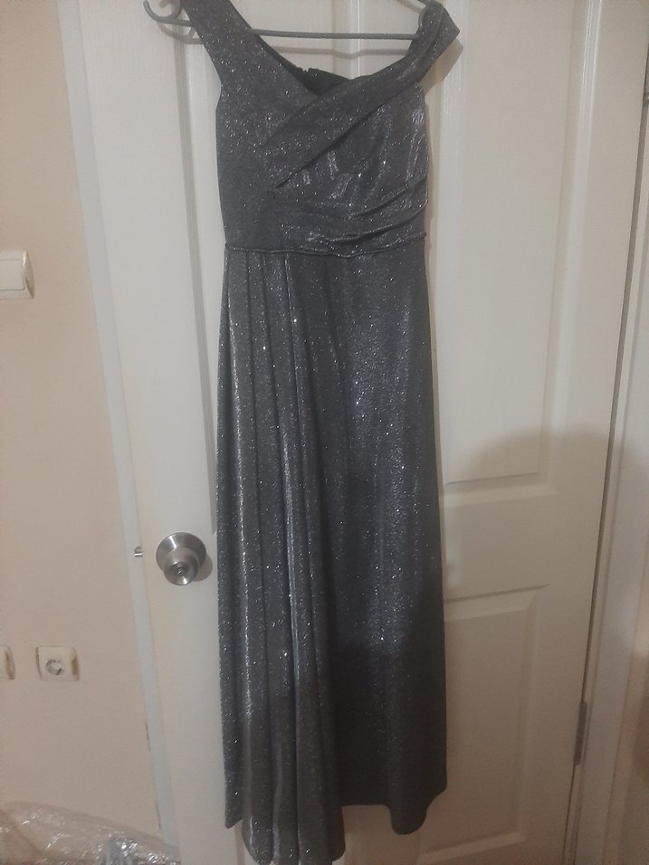 Drapeli tasarıma sahip, tek renk gri uzun abiye elbise. Fitted kesim ve kayık yaka ile klasik şıklık sunar, kolsuz ve parlak dokuda, özel davetler için uygundur. ✨