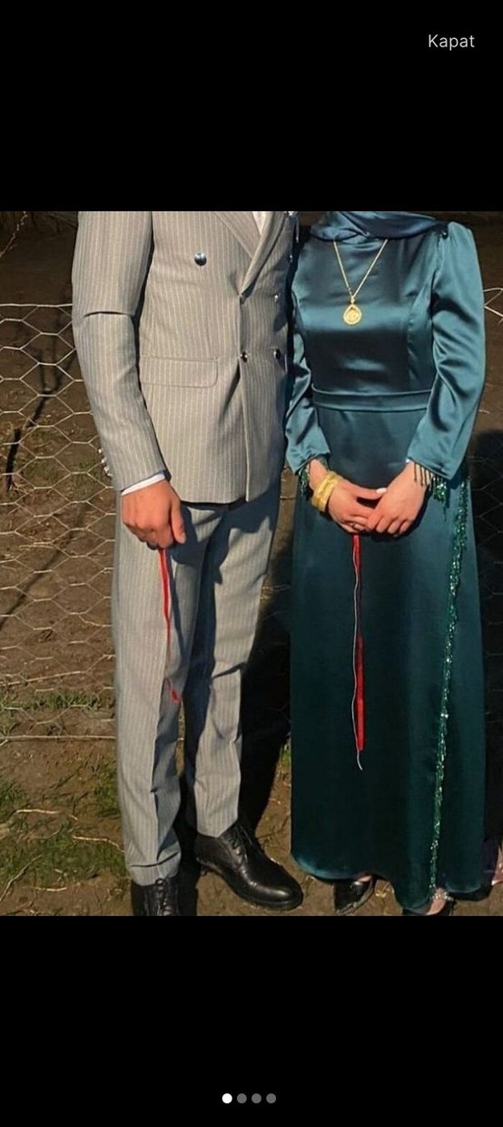 Bu mütevazı nişan elbisesi, uzun boy ve regular fit olup, kesimli yaka ve askılı kollara sahiptir. Gri batik deseni ve drapeli tasarımıyla düğünler için uygundur.