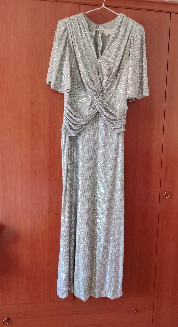 Drapeli ve V yakalı, yarım kol, uzun boy gri abiye elbise,payetli,şık ve klasik zarafet sunar. Parlak kumaşı düğünler için uygundur. ✨Sadece 2 saat giyilmiştir.