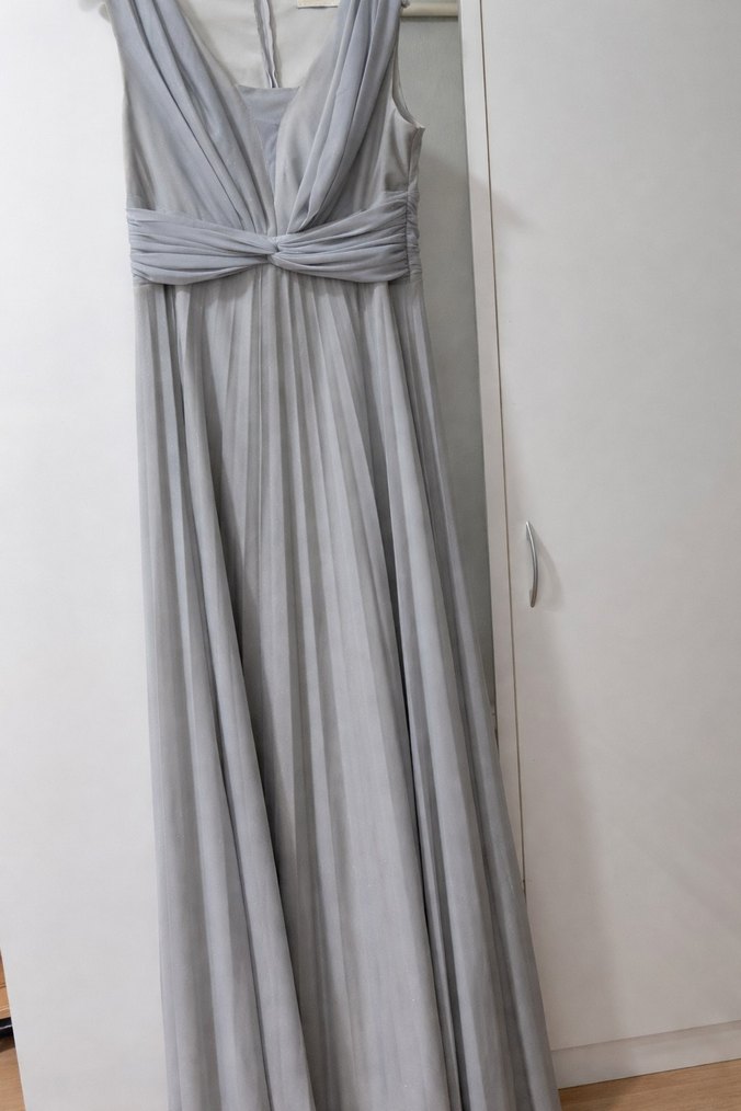 Gri renkte, drapeli detaylı, V yakalı ve kolsuz uzun abiye elbise. Düğünler için uygun, modern klasik ve minimal tasarıma sahiptir.