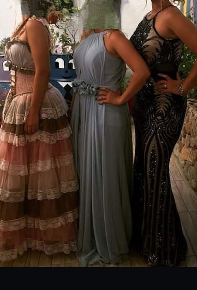 Bu gri, uzun ve vücuda oturan gece elbisesi, straplez yaka ve drapeli tasarımıyla etnik desenler taşır. Parti için uygun bir bohem stildir.