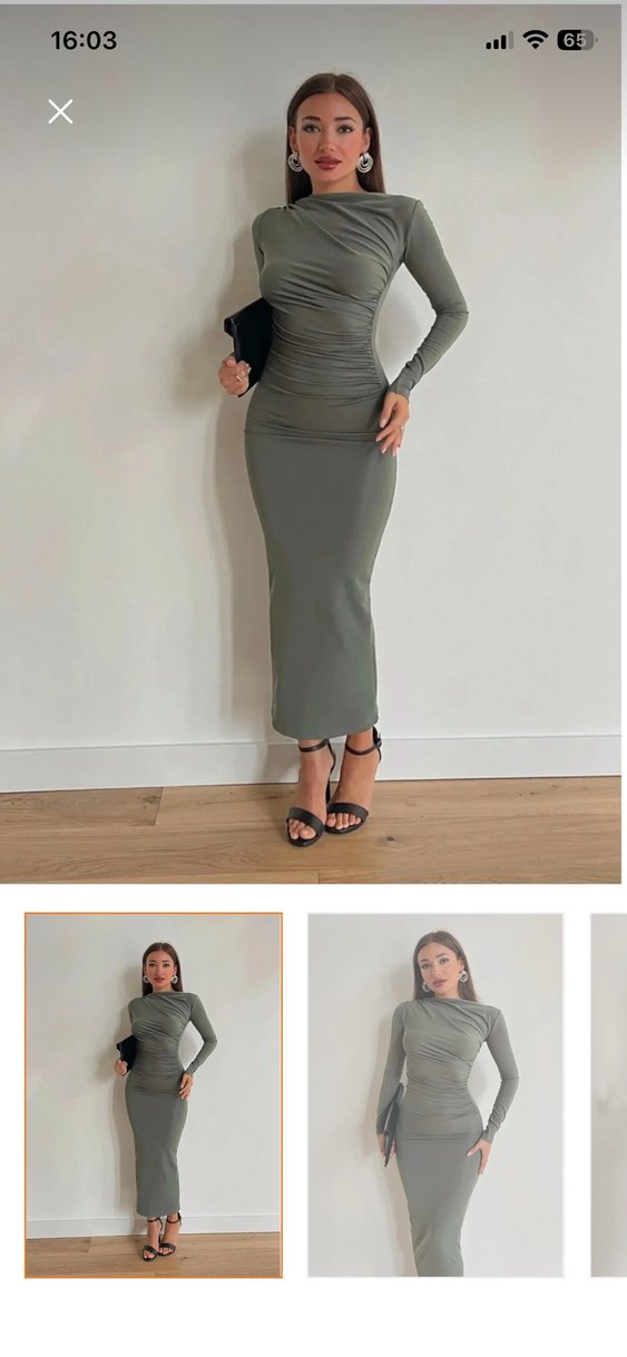 Drapeli detaylı, tek renk gri uzun elbise, tekne yakalı ve vücuda oturan kesime sahip. Günlük kullanıma uygun, minimalist ve çağdaş tarzda, yumuşak sentetik kumaştan.
