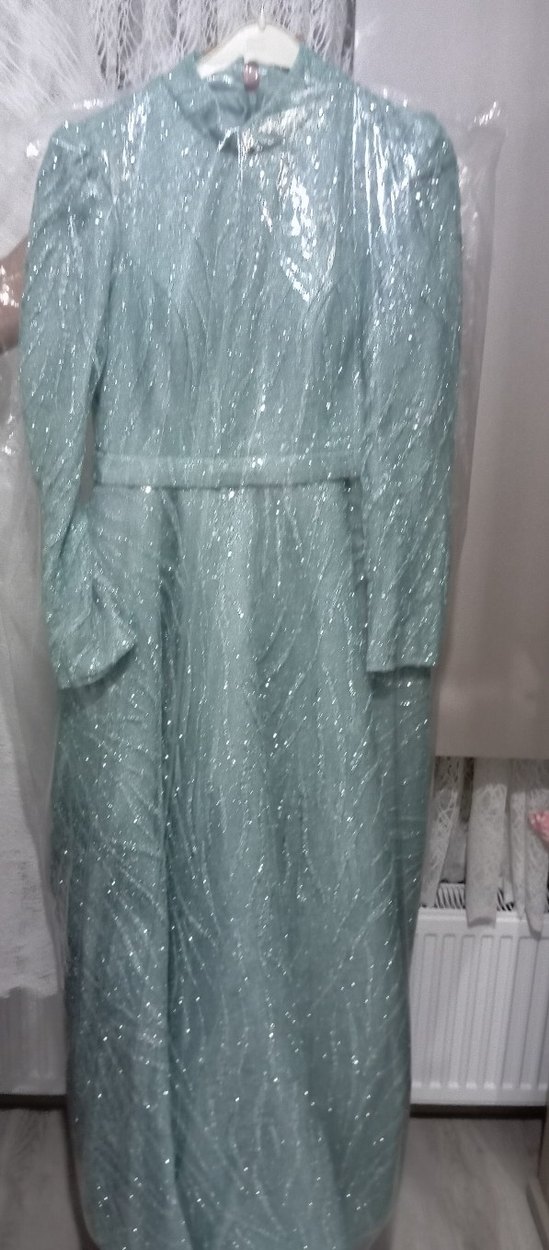 Gri renkte, uzun kollu ve drapeli detaylara sahip abiye elbise, düğün ve özel günler için uygun, regular fit kesimle sunuluyor. ✨